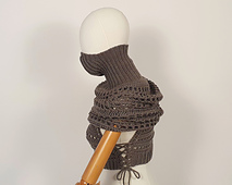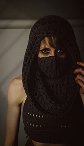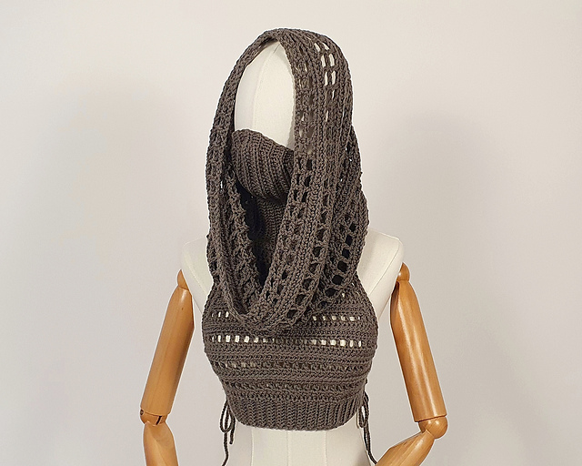 The Wasteland Top features a fitted face covering which folds down into a turtleneck-style collar, an oversized hood which folds down to stretch around the shoulders like a cowl/wrap and corset-style lace up sides.