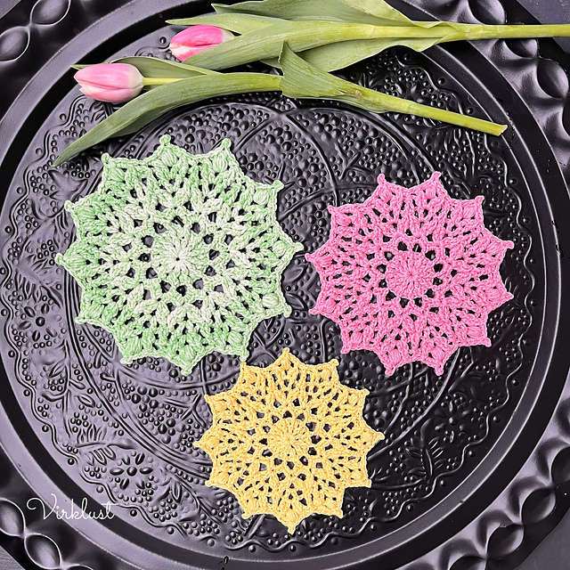 Textured mini doily. Finished size approx. 18 cm/7” in diameter (after blocking) using Scheepjes Catona. The pattern also comes with 2 other yarn suggestions.