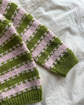 The green and pink Key Cardigan Junior is knitted in Peer Gynt by Sandnes Garn in the colors Matcha \[9564\] and Ballet shoes \[3521\].