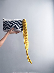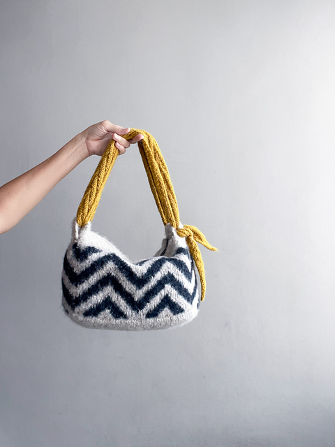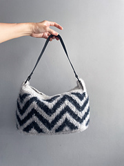 Vous pouvez utiliser une bandoulière achetée dans le commerce, réutiliser la sangle d’un ancien sac ou encore utiliser un foulard, par exemple, un foulard en soie étroit, pour la bandoulière. Si vous souhaitez que toutes les pièces de votre sac soient tricotées par vous-même, alors vous pouvez envisager de tricoter A Chic Scarf de Yamagara. A Chic Scarf est conçue pour compléter le ZZ Bag. Non seulement c'est un accessoire élégant en soi, mais son bord en i-cord renforce et stabilise l’echarpe pour éviter qu'elle ne s'étire, surtout lorsqu'elle est utilisée comme sangle. Le motif de maille croisées copie le motif en zigzag du ZZ Bag, et les extrémités étroites permettent de faire un joli nœud pour attacher l’étole au sac.