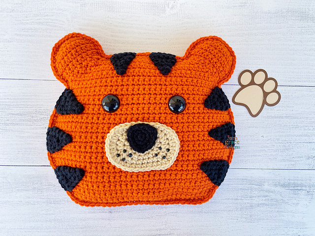 Our finished Tiger Head project is 9.5” x 10.5” using the recommended hook size. You are welcome to go up or down a hook size to create a different dimension. You can even hold two pieces of yarn together with a larger hook to create a giant cuddler. The sky is the limit!