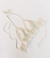 **Construction:** First, you will crochet two identical triangular cups, then you will crochet several rows across both cups to join them together into one panel while simultaneously integrating the neck ties. Next, you will crochet the body panel that hugs your rib cage, leaving plenty of space in the back for room to tighten the lace-up ties. The cups are sewn to the body panel, then the back tie is crocheted separately and woven through the eyelets along the front panel and tied in the back for a secure fit.