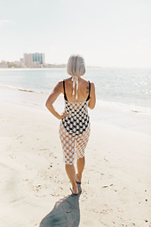 The playful lace pattern that makes up the delicate netlike fabric in the Pacific Swim Dress is a simple six-row repeat that even adventurous beginners will be able to conquer. A wooden ring connects the thick straps to the main body of the dress and creates the stunning halter-neck silhouette. The back of the dress has one of my favorite design choices to date: a stretchy thread that is woven through the top edge of the dress to cinch it close to your body, allowing the fabric to drape beautifully across your lower back and giving a refined, sophisticated fit to this swim dress.