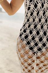 **Construction:** This striking swim dress is crocheted from the top down in a straight tube with no increasing or decreasing! The stretchiness of this beautiful lace stitch pattern creates the illusion of shaping, allowing the fabric to contour to your body while stretching over your curves. You will crochet directly onto a wooden ring and seam it to the body of your dress, then create thick straps for the neck ties that are crocheted directly onto the wooden ring. Lastly, a clear stretchy cord is woven through the top edge of the dress to create the drape seen on the back of the dress.