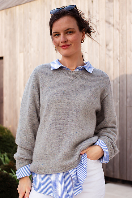 Sample shown in Lamana Yarns Como Tweed (100% merino, 120m per 25g ball) in shade Light Grey held together with Lamana Yarns Premia (60% Super Kid Mohair, 40% Silk, 300m per 25g ball) in shade Silk Grey.