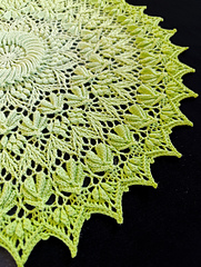 Your tension will determine things like hook size, yardage, finished size, and height of stitches. Any of these things can be adjusted as needed. Using recommended thread and hook this pattern will use minimum 600 yards / 570 metres of thread. And your finished doily will be about 15” / 38 cm in diameter.