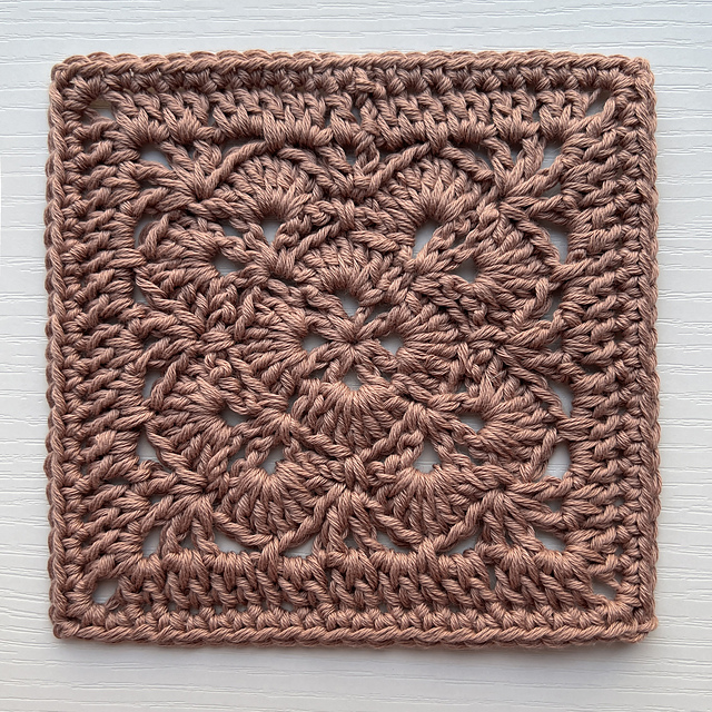 This square is a modification of the traditional shell stitch worked int the round to have straight edges and a square shape (instead of a scalloped edge like other shell stitch squares) which makes it easy to join and create projects with a grid/modular construction.
