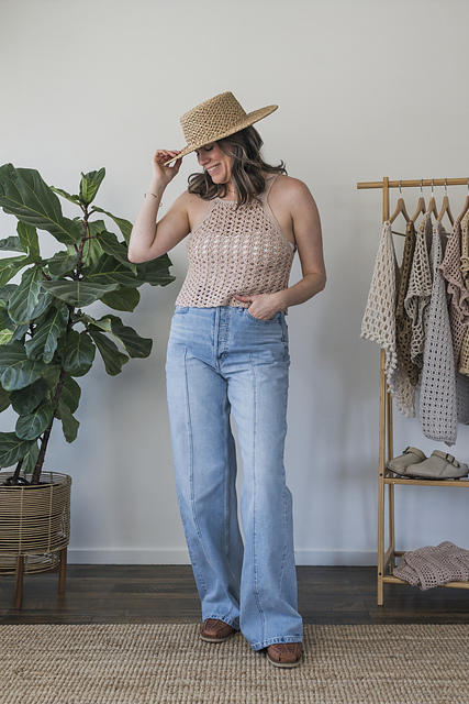 Top is worked in one piece from the neck down. Straps are worked after Top is complete. Instructions are written in sections: Top (Rows), Seam (Sew), Straps (Rounds), Neckline (Rounds).