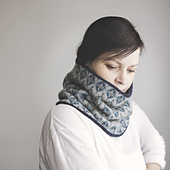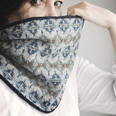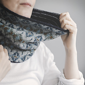 The Old Compass cowl is worked as a long tube in the round in two different patterns. The striped section is worked slightly longer than the other section to provide a slim color frame at the top and the bottom for the colorwork side. The cowl is slightly funnel shaped, which is achieved by changing the size of your needles through different sections.
