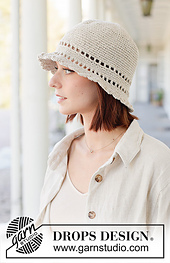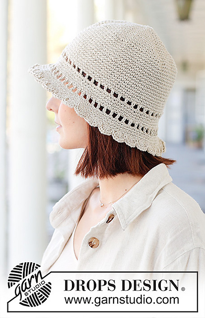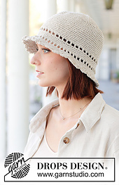 **Crocheted hat in DROPS Bomull-Lin. The piece is worked top down with double crochet, lace border and edge with fan-pattern.**