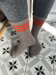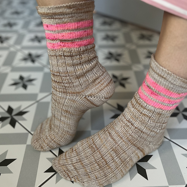 Sportsockan är en tunn strumpa som stickas uppifrån och ner. Det stickas ränder på skaftet