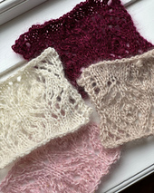 The work is knitted with 3 strands in total. 2 strands of Silk Mohair held together with 1 strand of Tweed.