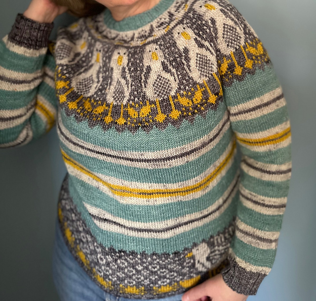This sweater is knit top down, in the round, with yoke worked in stranded colourwork, body with stripes, and a stranded colourwork section before the ribbing. I used duplicate stitch for the seagull beaks and eyes. Included in the pattern are both colour and black and white charts.