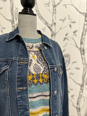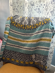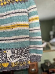 Ways to make it your own: use a single colour for the body and sleeves omitting the stripes and hem colourwork; repeat the seagull in profile more times around the bottom of the sweater (you may need to do some math for this); add the flying seagulls at the wrists before the cuff; use a colour fade set for the main colour; add stripes of flying seagulls or stripes of crabs and fish.