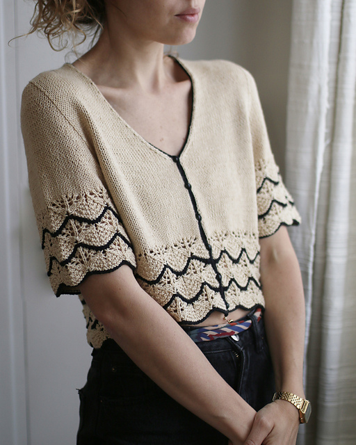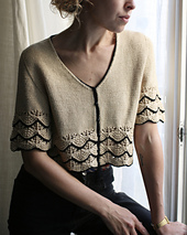The Sookie Blouse is worked bottom-up, combining flat and circular knitting. You’ll start by knitting the bottom of the body flat with an openwork lace border, then continue in stockinette stitch up to the underarms. The sleeves are worked separately in the round, following the same pattern, using the Magic Loop technique. You can choose to begin with either the body or the sleeves, depending on your preference. Once both are complete, you’ll join them to work seamlessly in one piece up to the final row using the bottom-up contiguous method. This technique creates structured armholes, set-in sleeves, and slanted shoulder tabs through a series of alternating decreases along the body, sleeves, and shoulders. To finish, an I-cord edging with buttonholes is worked along the front and back neckline using 3 mm needles.