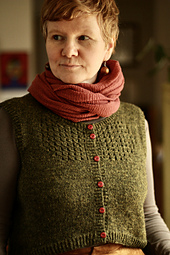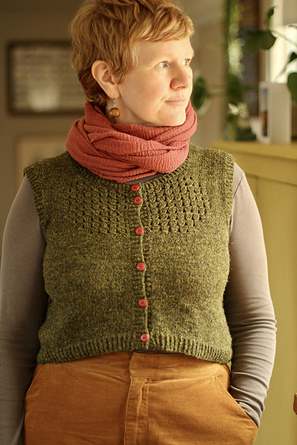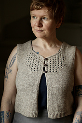 Originally designed with two views, Audrey in Unst now has a vest version as well. With different options for both the hem and the button band treatments, you can make the Audrey Vest truly your own. Worked seamlessly from the bottom up, you have straight or curved options for the hem and ribbed or I-Cord edging for the button band. The style of the vest is a more cropped look, but would be easy to lengthen if desired. Originally worked in a sport weight yarn, I chose a Shetland woolen spun fingering weight yarn for the vest that has the same gauge as the original cardigan. The yarn used blooms beautifully when blocked, so keep that in mind when choosing your yarn.