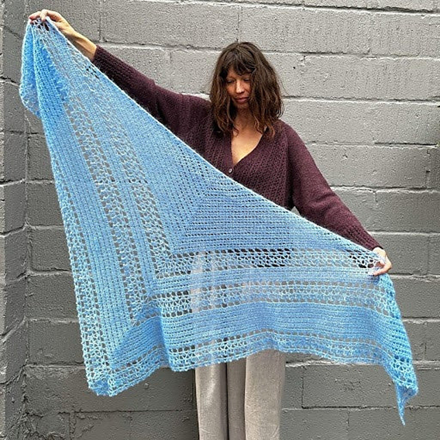 This triangular crocheted shawl combines a simple filet pattern, which is quick and easy to make, with a unique lace design.
