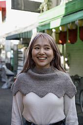 This cape is worked in an all-over twisted ribbing pattern. It is knit from the top down in the round until the front and back are divided to work the hem. Stitches are increased at both shoulder lines for a good fit. The scalloped hem is created with short rows.