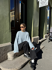 Thelma Sweater er en oversized genser som strikkes ovenfra og ned i ribb og falsk flettestruktur. Den er strikket i en garnkombinasjon som gjør at genseren er lett og luftig, og samtidig varm; med andre ord en genser som egner seg like godt på sene sommerkvelder som midt på vinteren. Genseren har vide ermer og oversized passform som skaper en retro og kul look til det pene flettemønsteret. Bakstykket strikkes først frem og tilbake og formes med økninger for å gi en drop-shoulder effekt. Videre plukkes det opp masker til skuldrene som samles og danner forstykket. Forstykket strikkes frem og tilbake, og strikkes sammen med bakstykket og danner bolen. Det plukkes opp masker til ermer som strikkes rundt. Halskanten strikkes i dobbelribb og legges dobbelt.
