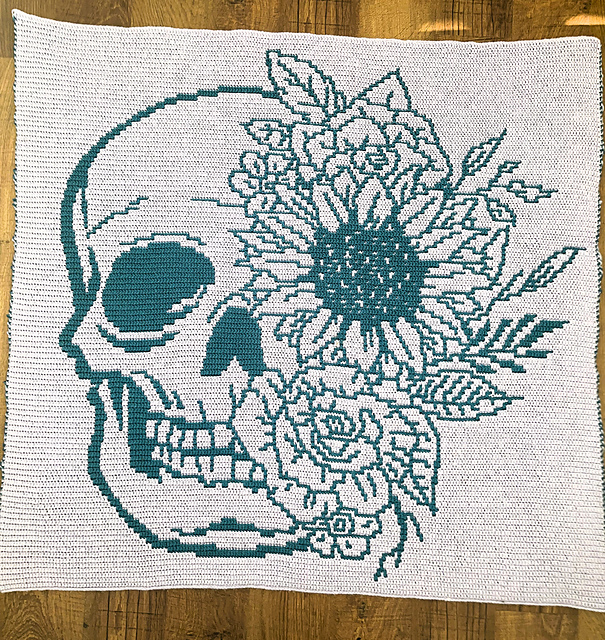 This is a crochet PATTERN ONLY (not a finished product) for a blanket using the Overlay Mosaic technique, which uses two basic crochet stitches to create a thick fabric featuring a picture or intricate design.