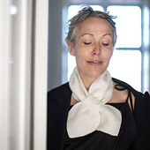 **BAM BAM BOW** is a small, soft bow scarf knitted in cashmere. The shape and functionality of the bow is inspired by a particular type of scarf that I remember from my childhood in the 70s and 80s.