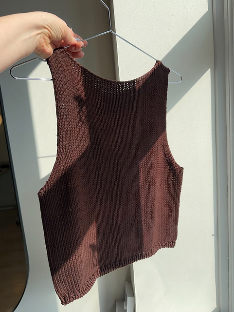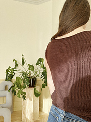 The top is knit from the top down. First the front is knit flat to the bottom of the arm hole. Then pick up stitches for the back along the cast on edge. The back is knit flat to the bottom of the arm hole, where the front and back are joined. The body is knit in the round the rest of the way.
