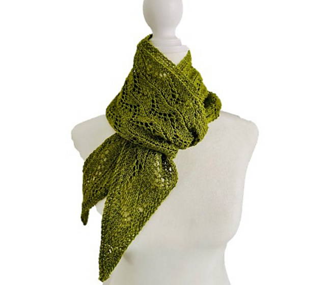 The sample is shown in a fingering weight yarn, but this scarf would look beautiful in just about any weight yarn. Simply adjust your needle size to achieve good stitch definition, and you'll be on your way to creating your own unique Swaying Branches Scarf.