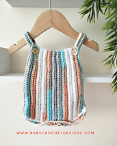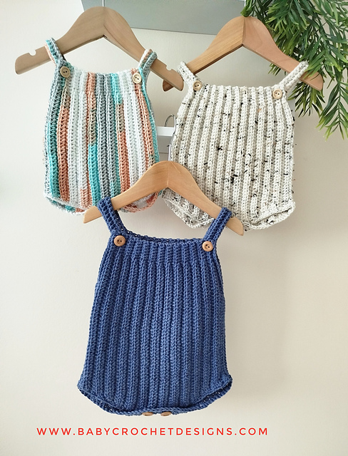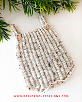 This cute ribbed romper is made with two panels then joining together down the sides. Using a simple half double crochet which creates a lovely texture and buttons to the crotch for easy nappy changes.