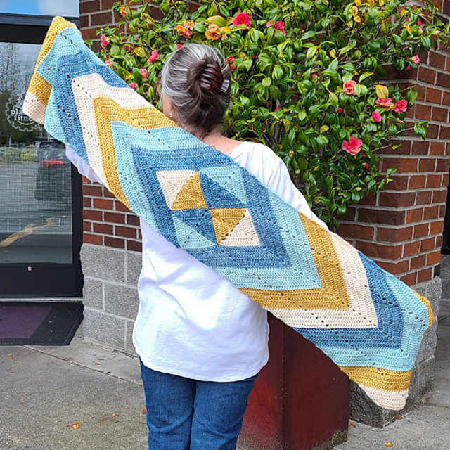 I love all the knit & crochet patterns lately that feature classic quilt blocks. This project is my interpretation of a quilt block being used as the center square of a wrap.