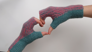 These mitts feature a unique variation of the Indian thumb gusset, with mirrored shaping on both sides, allowing for striking colour blocking and a contrasting thumb detail.
