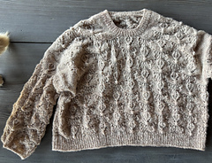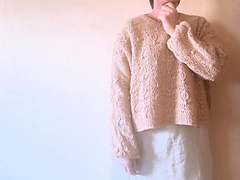 です. 後ろ身頃を往復で脇下まで編み, 目を休ませます. その後, 後 ろ身頃のCO目から左前身頃の目を拾い, ネックまで編み, 目を休ま せます. 同じ要領で右前身頃の目も拾って編み, その後左右の前身 頃をつなげて, 脇下まで往復で編みます. そこから前後身頃をつな げ, 輪で裾まで編みます. 袖は袖開きから拾い目をして, 袖口に向 かって輪で編みます. 最後に被り口から拾い目をしてネックを編み, 完成です.