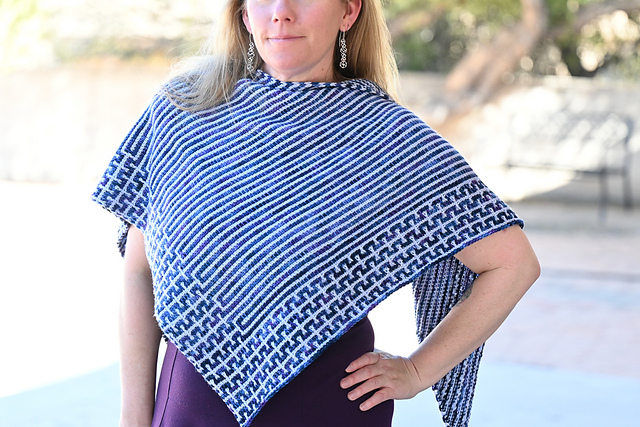 The **Calliope Mosaic Shawl** is a striking yet approachable shawl for folks new to Tunisian mosaic stitch. The design uses two colors of sport weight yarn from Bad Sheep Yarn for a cozy shawl that still has plenty of drape.