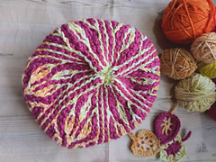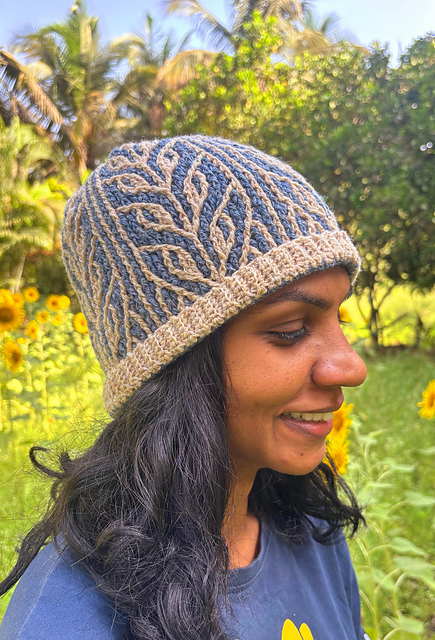 La Résilience Beanie is a sister pattern of a beautiful cowl made to be worn close to the neck. Brioche crochet is used to create a motif of lovely foliage and strong vertical stripes.