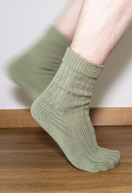 The socks are worked toe-up with a 3x1 rib that flows from toe to cuff. A ribbed gusset ensures a comfortable fit, followed by a German Short Row heel turn and a reinforced heel flap. The leg continues in ribbing and finishes with a 1x1 cuff. Instructions are included for both a stretchy bind-off and a doubled cuff with a grafted finish.