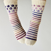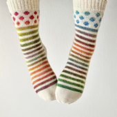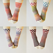 These socks are knit from the cuff down with a section of colorwork on the leg, a reinforced heel with a gusset, and a round toe or a classic pointy toe.