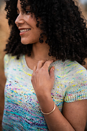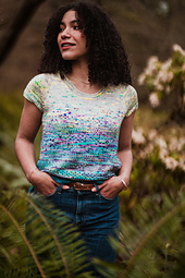 Knit in fingering-weight yarn for a breathable, layerable tee or sweater that works all year. Choose short or long sleeves, soft fades or bold contrasts—whatever feels right.