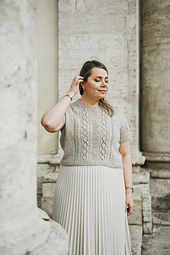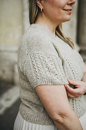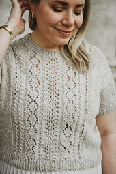 The Dido tee has a boxy fit and dropped shoulders. It is knitted seamlessly top-down with a lace and cable pattern on the front and the sleeves. The tee is started at the back neck and increased to the full width of the back. Then stitches are picked up for the shoulders and worked as the front of the tee. The front and back are joined at the underarm and the body is then worked in the round. The stitches for the sleeves are picked up from the body and the sleeves are worked in the round with a bit of short-row shaping at the sleeve caps to improve the fit. Lastly, stitches for the neckband are picked from the neck opening and worked in ribbing in the round. The neckband, hem and cuffs are finished with a tubular bind off, which provides a beautiful and stretchy edge that looks like the stitches roll over the edge to the other side of the ribbing.
