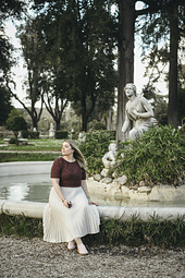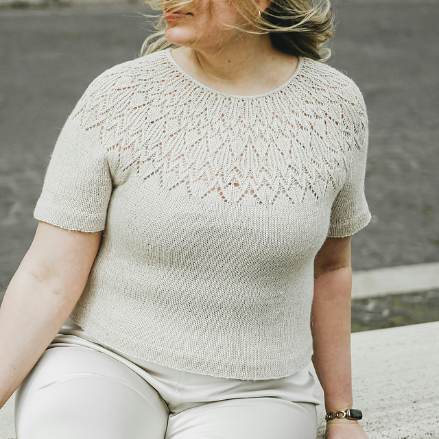 The Venilia tee is knitted seamlessly from the top down, beginning at the neckband. A beautiful lace pattern is worked on the yoke. The sleeves and body are separated at the underarm and knitted separately. The back is shaped with short rows to give it a bit more length and to improve the fit.