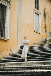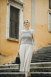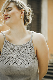 The Venilia top is knitted seamlessly from the top down with a beautiful lace pattern on the front and back. The front and back are knitted separately down to the armholes. The pieces are then joined, and the body is knitted in the round. The hem is folded double to give the top a neat, finished look. The top edges of the front and back are finished with an i-cord edging that continues seamlessly into the straps.