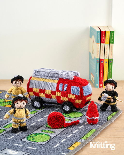 Knit a heroic firefighter play set, perfect for little rescuers and imaginative adventures!