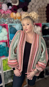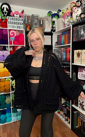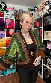 This is Wickedly Handmade’s take on their Wild Oleander Hooded scarf TURNED Hexagon Cardigan!