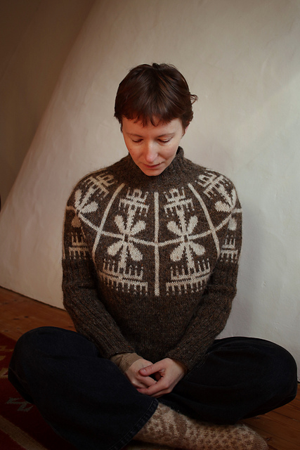 The sweater is knit top-down in the round. It’s a round yoke pullover with a deep yoke, almost like a swoncho, tapered sleeves and boxy body. In smaller sizes the yoke is as deep as the height of the colourwork section, in larger sizes you can choose to split for the body and sleeves as soon as colourwork is done. The neckline is shaped with short rows. All edges and the sleeves are worked in 2x2 ribbing.