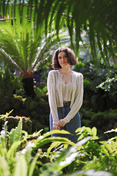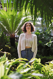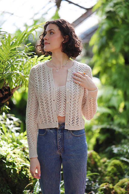 An elegant lace cardigan to wear while sipping your afternoon tea and eating your crumpets. Knit from the top down with a simple 7-stitch lace motif, you will be shocked at how quickly this drop sleeve cardigan works up. Pair it with the [Crumpet Camisole][2], as I have done in the photos, for a darling matching set moment. Perfect for any season and any reason!