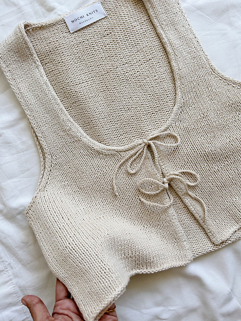 The Surya top is knitted from top to bottom in stockinette stitch. It starts by knitting the shoulders with short rows, then it is knitted until the armholes, and finally, the front and back are joined together to the desired length.