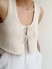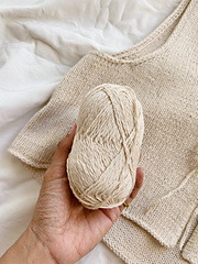 El Top Surya está tejido de arriba hacia abajo en punto jersey. Comienza tejiendo los hombros con vueltas cortas, luego se continúa hasta la sisa y, finalmente, se unen los delanteros y la espalda hasta alcanzar el largo deseado.
