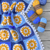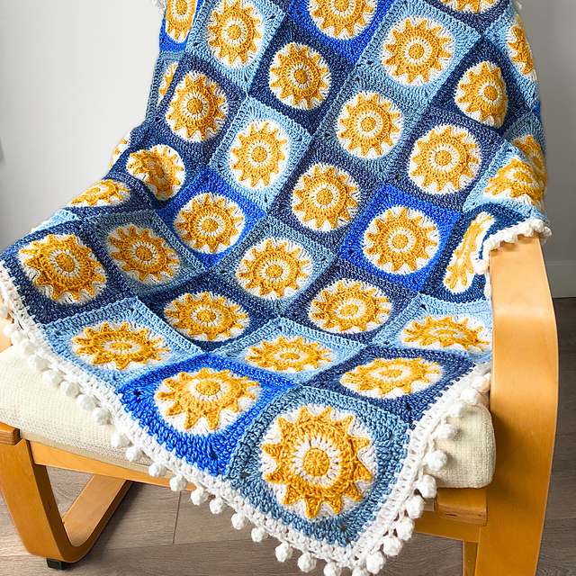 Blue skies, yellow suns and fluffy clouds; this joyful blanket is inspired by the moment the sun breaks through the clouds, bringing the promise of brighter days ahead. Featuring sunshine-filled granny squares, the Hazy Sunshine Blanket builds up motifs using the join as you go technique, before finishing with a choice of a pompom or shell stitch border.