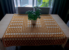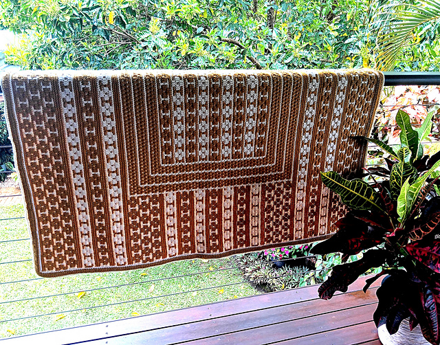 This throw is square 130cm x 130cm. The size can be made larger by adding more pattern blocks before and after the middle panel as well as above and below. Again be aware of the extra yarn amounts.