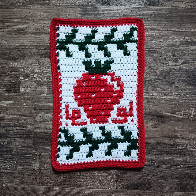 Summertime Strawberry is a repeatable pattern comprised of 3 different motifs—the strawberries themselves, which are 24 stitches by 23 rows, and vines facing two different directions, which are 24 stitches by 11 rows.