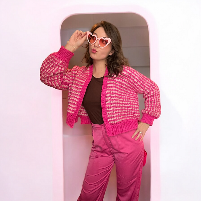 THIS CARDI IS THE ULTIMATE BLEND OF CLASSIC AND PLAYFUL! THIS CHIC HOUNDSTOOTH CARDIGAN IS CREATED USING ALTERNATING SINGLE AND DOUBLE CROCHETS TO ACHIEVE ITS SIGNATURE TEXTURE. MADE TO SIZE FOR A PERFECT CUSTOM FIT, IT'S A TIMELESS YET TOTALLY STATEMENT-WORTHY PIECE. WHETHER YOU’RE STRUTTING INTO HARVARD OR JUST ADDING SOME FAB FLAIR TO YOUR WARDROBE, THIS CARDIGAN IS, LIKE, TOTALLY A MUST-MAKE!