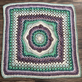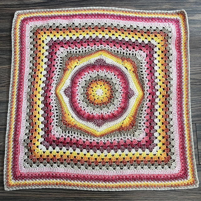 Designed for All Wound Up Yarn Shop and the 2025 Puget Sound LYS Tour, this car seat sized blanket is an engaging blend of elegant mandala center stitches, easy granny square stitches in the middle, and linen stitch for the border. It’s a small size, which makes it perfect for the carseat, or for toddler hands to cuddle and carry it around.